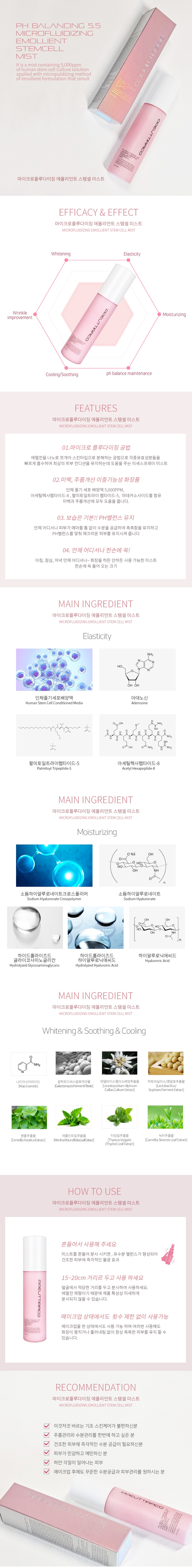 정제수, 글리세린, 부틸렌글라이콜, 프로판다이올, 다이프로필렌글라이콜, 세틸에틸헥사노에이트, 트라이에틸헥사노인, 글리세레스-26, 1,2-헥산다이올, 나이아신아마이드, 폴리글리세릴-10다이올리에이트, 수크로오스올리에이트, 트레할로오스, 인체줄기세포배양액(5,000ppm), 갈락토미세스발효여과물, 병풀추출물, 다이포타슘글리시리제이트, 동백나무꽃추출물, 동백나무씨추출물, 에델바이스캘러스배양추출물, 동백나무씨오일, 애플민트잎추출물, 타임잎추출물, 녹차추출물, 락토바실러스/콩발효추출물, 소듐하이알루로네이트크로스폴리머, 마데카소사이드, 하이드롤라이즈드글라이코사미노글리칸, 겨우살이잎추출물, 아시아티코사이드, 띠뿌리추출물, 소듐하이알루로네이트, 만주자작나무싹추출물, 유럽개암싹추출물, 올리브나무싹추출물, 호두나무잎추출물, 하이드롤라이즈드하이알루로닉애씨드, 아시아틱애씨드, 마데카식애씨드, 팔미토일트라이펩타이드-5, 아세틸헥사펩타이드-8, 하이알루로닉애씨드, 아데노신, 폴리글리세릴-6카프릴레이트 , 폴리글리세릴-4카프레이트, 소듐시트레이트, 시트릭애씨드, 에틸헥실글리세린, 다이소듐이디티에이 |